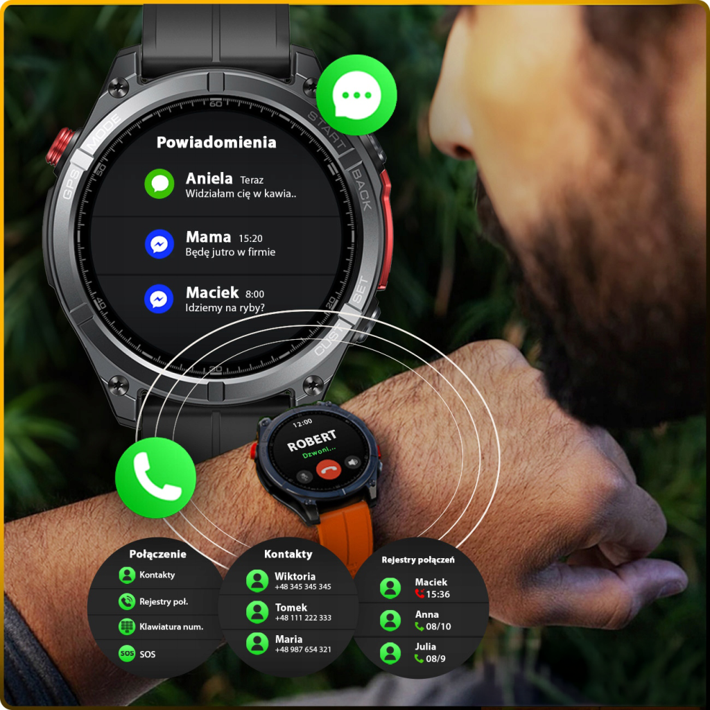 ✅ Rozmowy telefoniczne – wbudowany mikrofon i głośnik umożliwiają prowadzenie połączeń bezpośrednio z zegarka